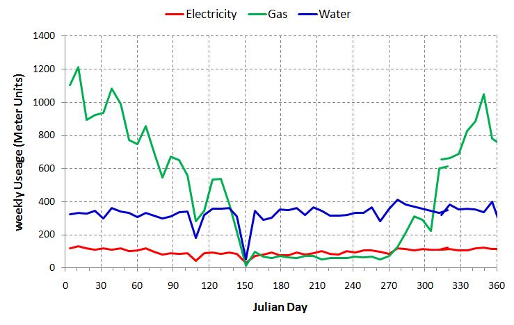 Over the last year, I have taken a meter reading for each of my household utilities every weekend. I started just after we had a water meter installed and I wanted to make sure I was checking regularly for leaks. The data is displayed graphically below. Some points of interest are: