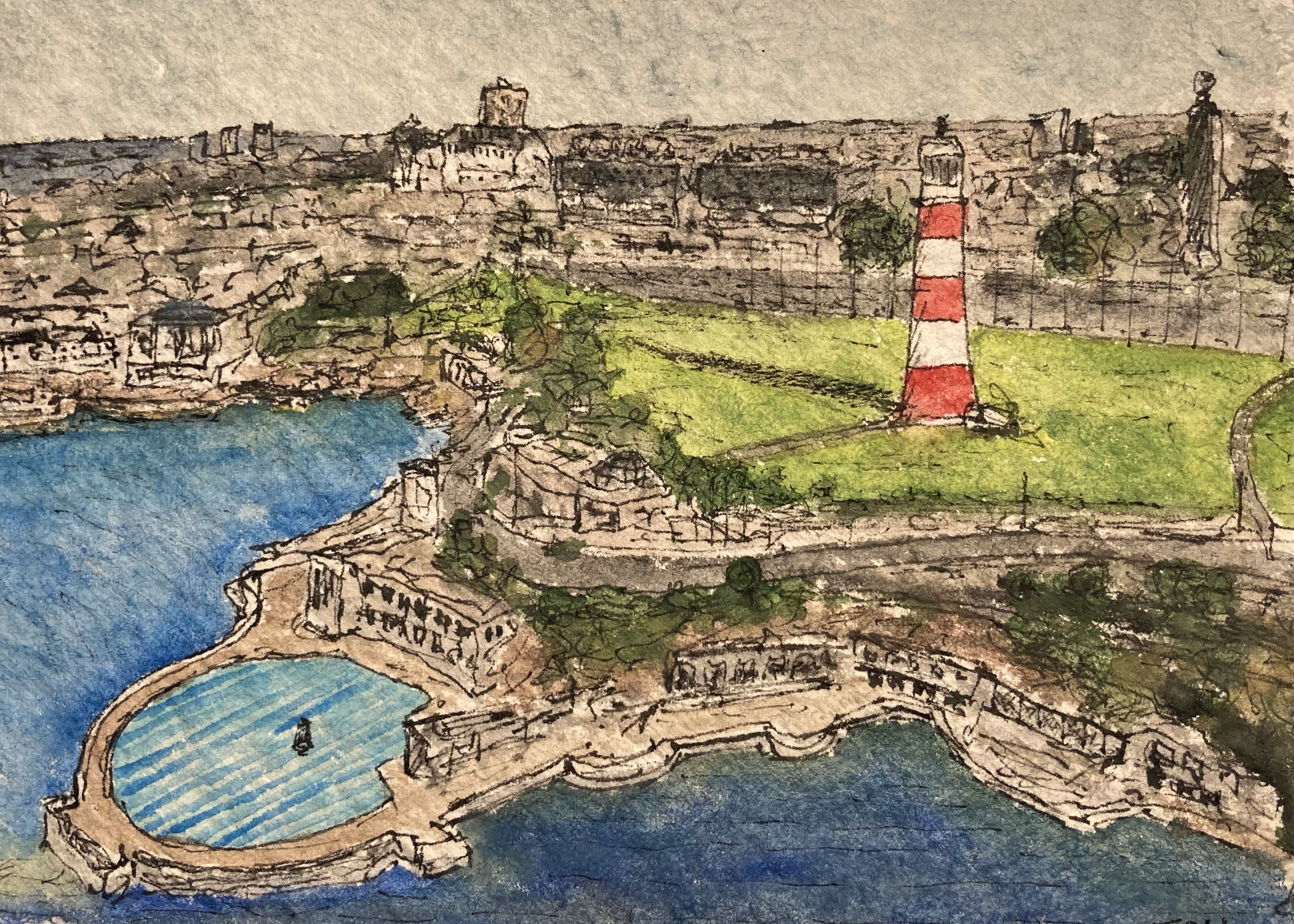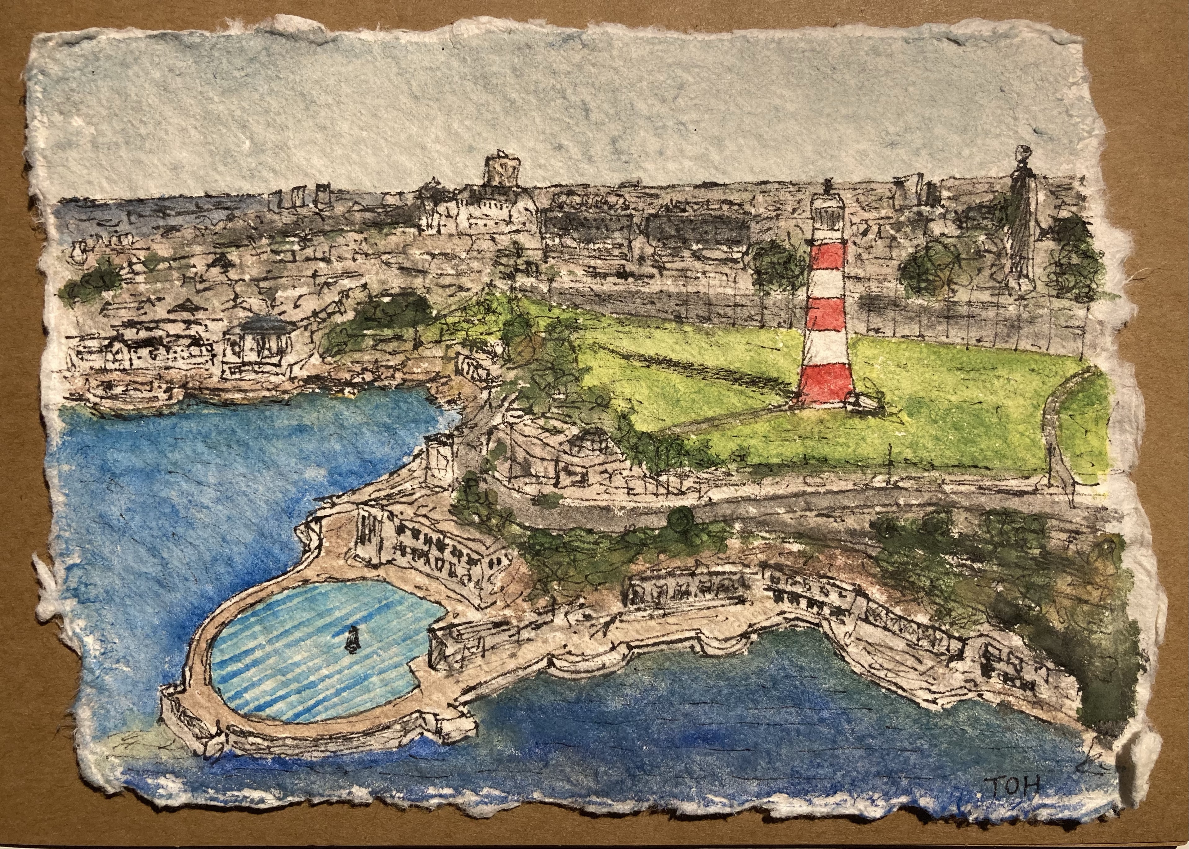 So, I sat down to paint a picture to make the card with and was faced with a decision: what to paint? I thought about painting a countryside scene from somewhere near the holiday let or one local to us (e.g. Dartmoor) but in the end I plumped for a view of Plymouth waterfront and found a suitable photograph online to use as a basis. I was really pleased with how the resulting picture ended up – it is the first time that I have tried to capture such a large built-up area in a painting and whilst the size of the picture (~10 x 15cm) means (deliberately) that there is little scope for lots of detail, I’m happy with the extent to which I have worked in sufficient detail to capture the main features of the buildings in the foreground and enough of their sense in the background.