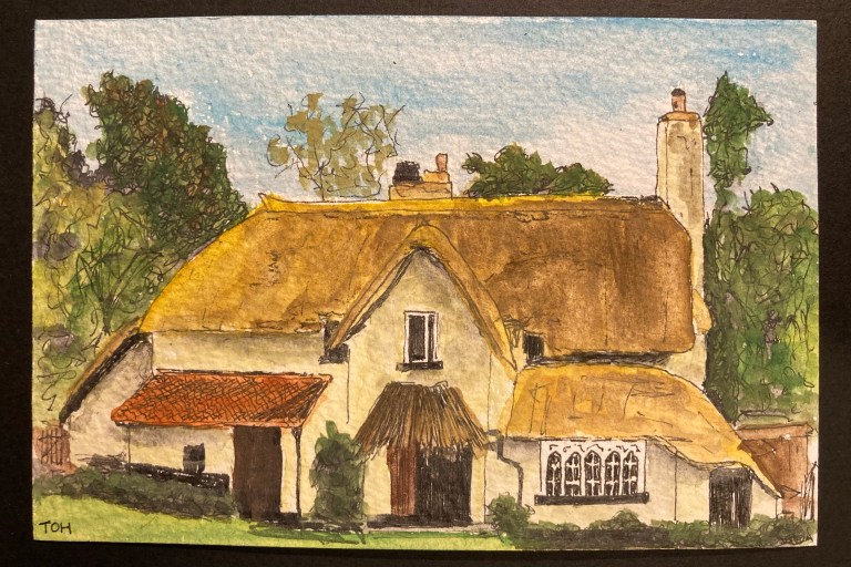In the last couple of months it seems to have become routine that every time a family member or a close friend has a birthday I paint a small picture of a place that has a special meaning or is a favourite for them and use it to make a bespoke birthday card. Back towards the end of January it was my sister’s turn, and knowing how much she liked to visit the Periwinkle Tea Rooms at Selworthy, on the fringe of Exmoor in Somerset, the choice of subject matter was an easy one for me to make.