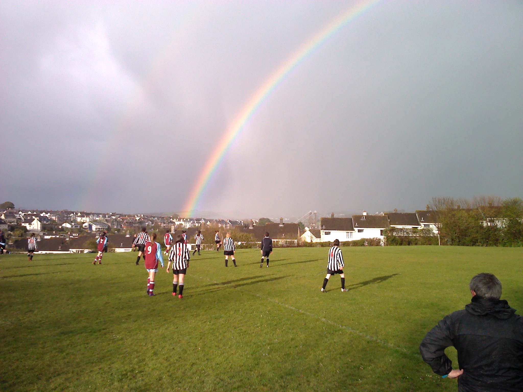 A couple of evening’s back my younger daughter had a football match at Saltash. It was a day of heavy showers and, sure enough, just prior to kick-off the heavens opened and we all got soaking wet. But on the positive side we got to witness one of the most spectacular rainbows I have ever seen as we looked north-east towards Plymouth – it was a full arc double rainbow and although the outer bow was somewhat weak the inner one more than made up for it with incredibly vivid colours. Unfortunately I was concentrating mostly on watching the match and only had my phone with me (which doesn’t have a great camera), but I did manage to get this snap of it, which I thought was worth sharing: