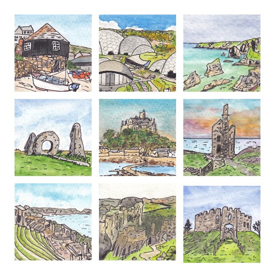 I like to try to spend a little time painting on as many days as I can, and for obvious reasons, the key to this is to keep my pictures small. One of my favourite formats seems to be 5cm square pictures painted in a fairly loose style, with not too much detail and a fairly limited colour palette. Each picture starts with a few pencil marks that serve as guide lines for the pen work, mostly outlining key features and providing various forms of shading. Once the ink has dried, which only takes a few seconds, I start to apply the watercolour paint, usually colouring the sky and any large blocks of vegetation first, before moving on to fill in any details. The whole process generally takes less than 30 minutes and my preference is to spend time of this as pretty much the first thing I do in the morning. When I completed my first small picture, I didn’t have any particular plans for further pictures on the same theme, but one picture led to another, and it seems that I end up producing these miniature watercolours as part of a series, first Dartmoor Scenes and then House Plants, Capital City Landmarks, and a series of slightly larger Mysterious Britain pictures. Most recently, returning closer to home, I completed this set of pictures showing various landmarks in our neighbouring county, Cornwall.