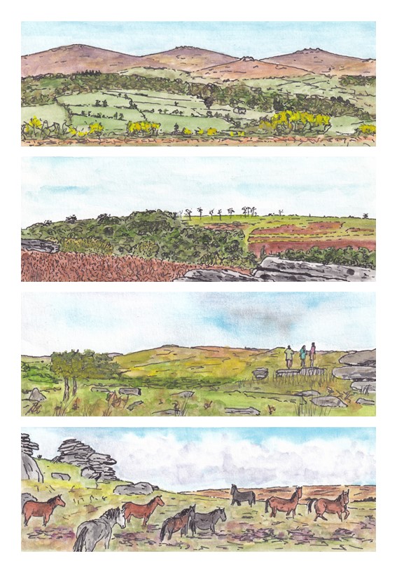 The proximity of Dartmoor to our home in Plymouth generally means that it is our go-to place for weekend walks, so it is hardly surprising that my phone is full of photographs of Dartmoor landscapes. I’m a particular sucker for ‘big views’, but my attempts to capture these in photographs are always something of a let down. Looking with the naked eye, big views fill my visual space with rich detail, but on camera everything seems to shrink, recede and flatten, resulting in a rather distant picture that is dominated by sky, and especially foreground, that the brain somehow filters out of the live view. I expect that this phenomenon is well understood by photographers, and it probably even has a special name, but to me it is just known as ‘disappointment’. This is compounded by the difficulty that I face when I subsequently try to capture this same kind of open, expansive view in one of my paintings. The part of a photograph that I want to paint seems to be only a small component of the whole, and no amount of zooming in seems to really help.