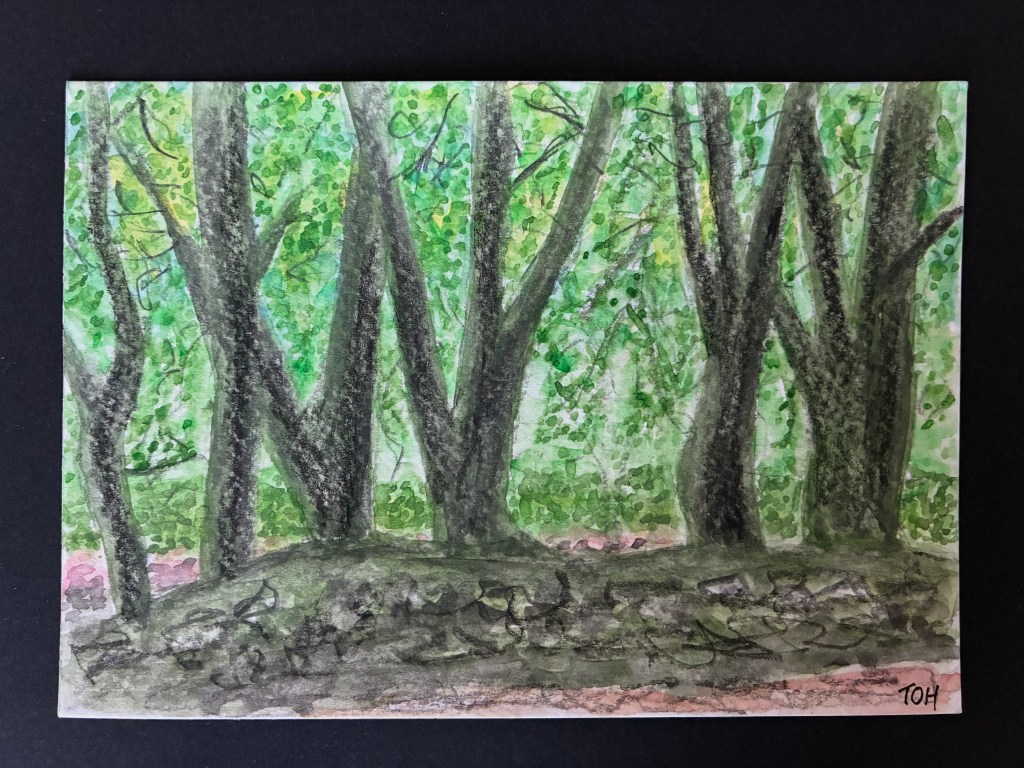 The result of my efforts is shown in the picture above – a charcoal -cribbles-with-watercolour painting of a row of what I refer to a ‘wall trees’, somewhere in the valley of the River Walkham, from a photo that I had taken on a walk there.