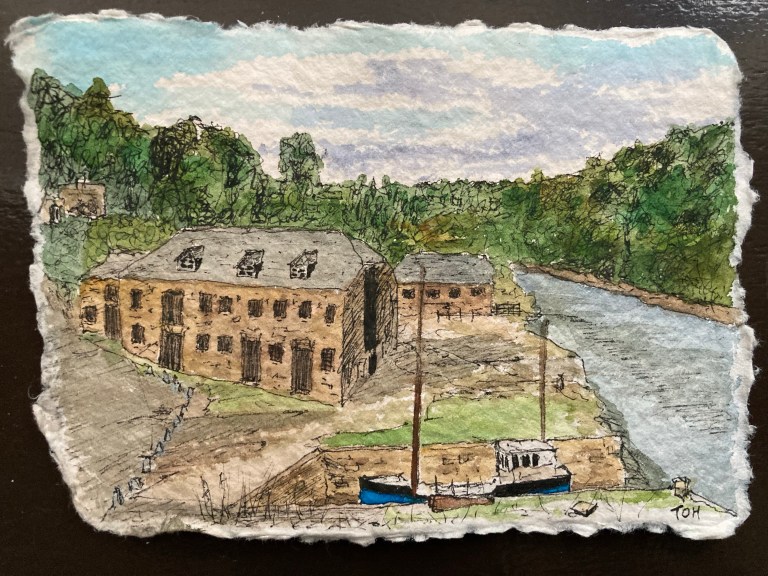 All of which is a very long-winded way of explaining why, one Sunday afternoon towards the end of January, with us unable to go out for a walk anywhere, I drove down to The Box (museum) in Plymouth where I subsequently sat with a coffee and some of my drawing and painting gear while my wife walked down to meet me and hour or so later. I didn’t have any kind of plan, but after a quick search for interesting images of local places, I selected a photograph of Cotehele Quay on the Cornish side of the River Tamar about ten miles north of where I sat and set to work.