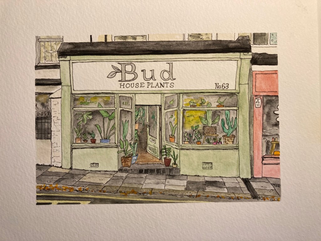 My initial foray into painting house plants stemmed from a ‘location’ painting that I did back in November as a birthday present for a family friend who just happens to run a wonderful plant shop in Plymouth. The picture I produced was much appreciated and has subsequently been professionally framed and put on display…