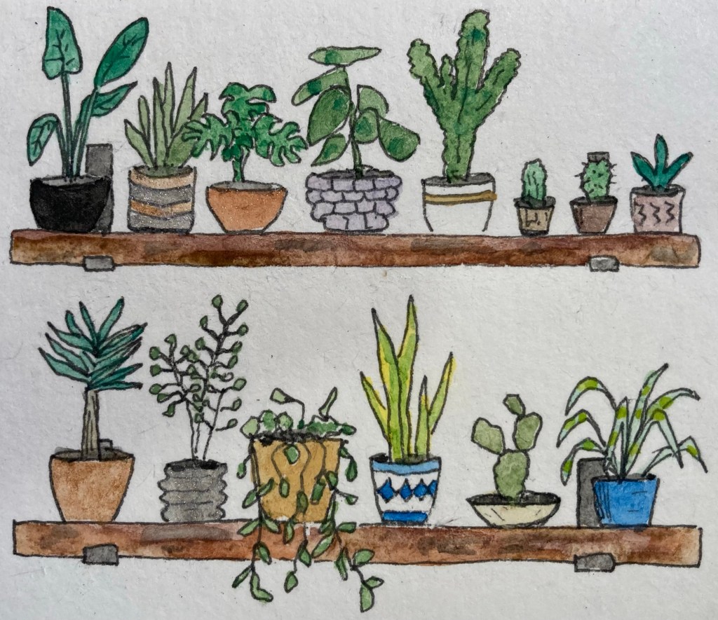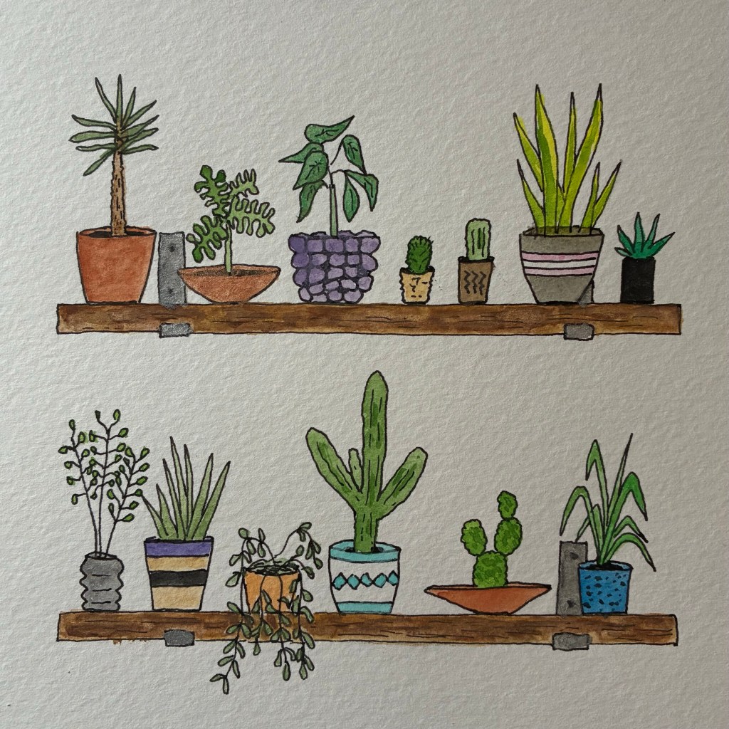 To bring things right up to date, a couple of days ago I sat down and painted a second version of my ‘house plants on shelves’ picture, and this time I made sure that I positioned the painting in the middle of a larger piece of watercolour paper so that I could subsequently crop the picture without fear of pruning the plants! I’m pleased with the result (see below), and I can now go ahead and get some copies printed ready for sale.