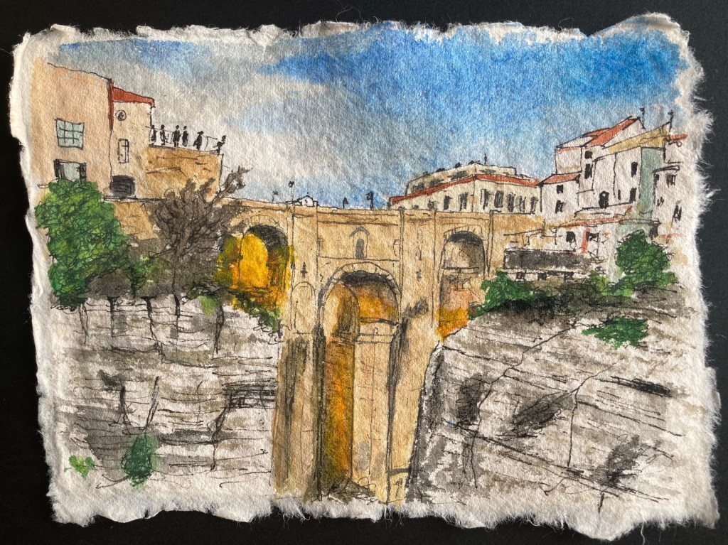 Funnily enough, despite being an incredibly scenic and much photographed location, with its deep gorge and steep cliff faces, Ronda was also a difficult subject to find a suitable picture to recreate as a painting. Most of the photographs of the town that I could find online were either taken from a distant vantage point designed to show the full majesty of the cliff-top location (which then made all of the interesting details of the buildings etc. shrink to an unworkable size) or were focused on a single ornate building or just the bridge that spans the gorge (and so did not really capture anything about the setting). In the end I opted for this shot of the bridge with a decent chunk of the cliff faces visible and some suitably Spanish-looking buildings. I tried to capture some of the drama in the scene as the setting sun creates its own lightshow between the pillars of the bridge. The picture/card was certainly appreciated, so I can’t have done too bad of job!