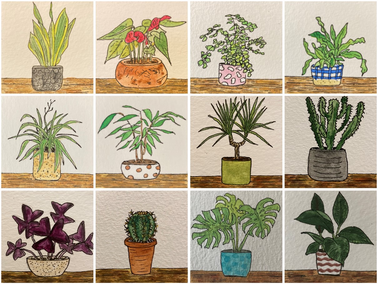 The next time we paid a visit to the shop it was suggested that I might produce some house plant greetings cards and have them for sale alongside some others (quite different) produced by a couple of local artists that were already on sale in the shop. Unfortunately, when painting my original picture I had not thought about placement of the design, and with some of the painted areas reaching almost to the edge of the paper it was not easy to use it for a printed card without risking some fairly crude surgery to some of the plants on the top shelf! However, that conversation sowed the seed of the idea in my mind, and so when I was considering where to go next with my mini-paintings, house plants were an obvious choice.