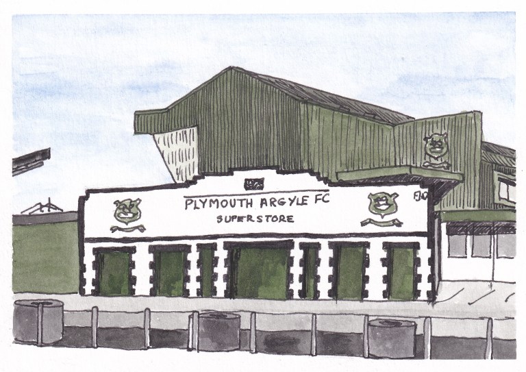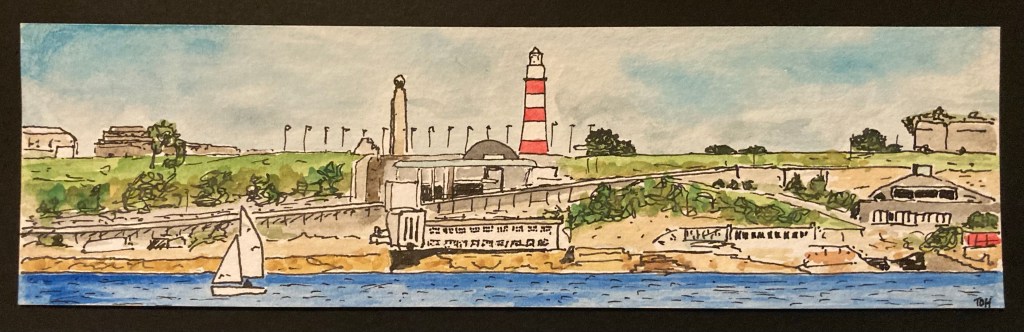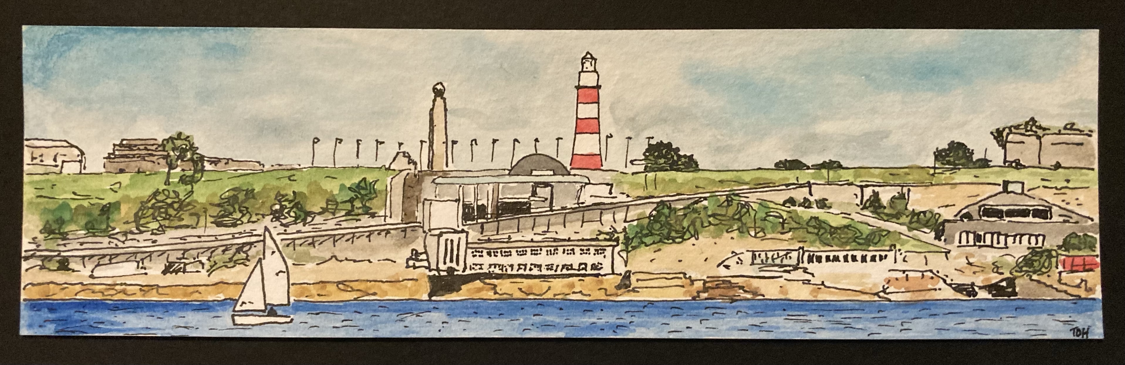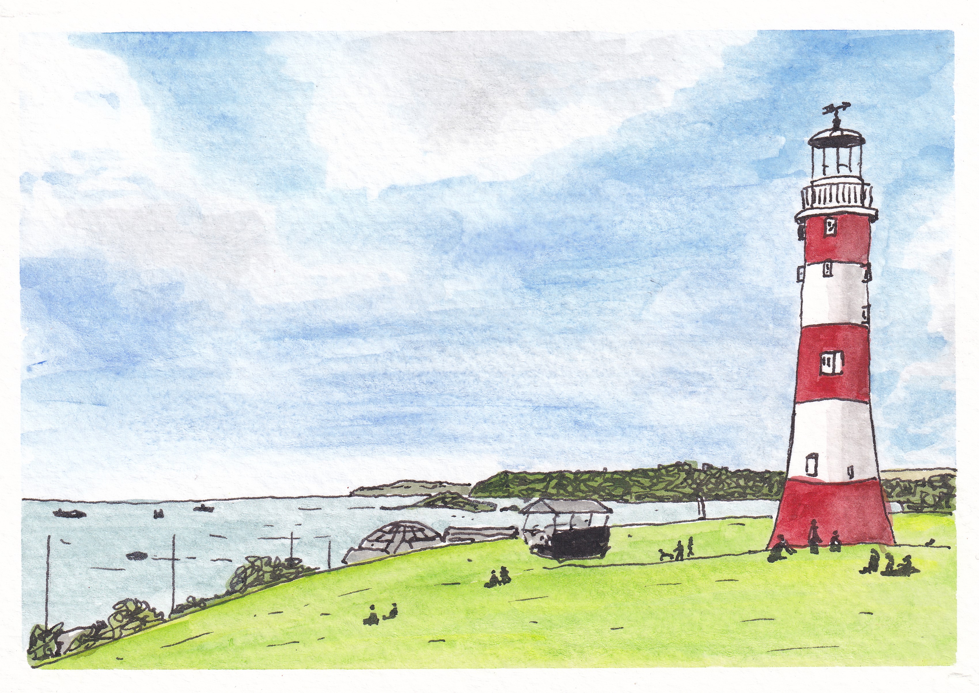 Back in April, after completing four series on miniature watercolour pictures (Dartmoor Scenes, House Plants, Capital City Landmarks and Mysterious Britain), I decided that I would give myself a new challenge by scaling up my paintings a bit and keep my subject matter close to home with a set of pictures that I described with the working title ‘Plymouth Postcards’. I wanted to try to keep the same kind of fairly loose style but I thought it would be good to be able to capture a bit more detail of each scene. My miniature watercolours had been just 5cm square (or 5cm x 7cm in the case of the Mysterious Britain series) but this new series was, naturally, postcard sized (roughly 10cm x 15cm). That’s an increase in area of up to six times, and so it gave me quite lot more sketching, drawing and painting to complete!