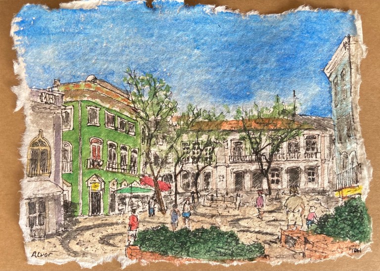 Back in April, I set out to create one such card, this time for Ann, the wife of my wife’s father. For some years, Ann and Keith greatly enjoyed holidays at the resort of Alvor on the Algarve coast of Portugal, but health issues and reduced mobility have meant that these trips have not been possible for quite a while now. Consequently, we decided that it would be fitting for me to paint a scene of Alvor to use for Ann’s card. I took a look online, googling images of Alvor, but couldn’t find anything that grabbed me until I came across what I thought was a suitable picture on a tourist site that was promoting the merits of Alvor. It showed an attractive open square, with people going about their business, a few trees and plants, and some interesting patterns in the paving, surrounded by some fairly grand, old buildings, including one that was a striking bright green – perfect to add an interesting splash of colour to the scene. I duly set to work and perhaps 45-60 minutes later, and as I usually do, I posted the finished picture to my social media accounts on Bluesky and Instagram.
