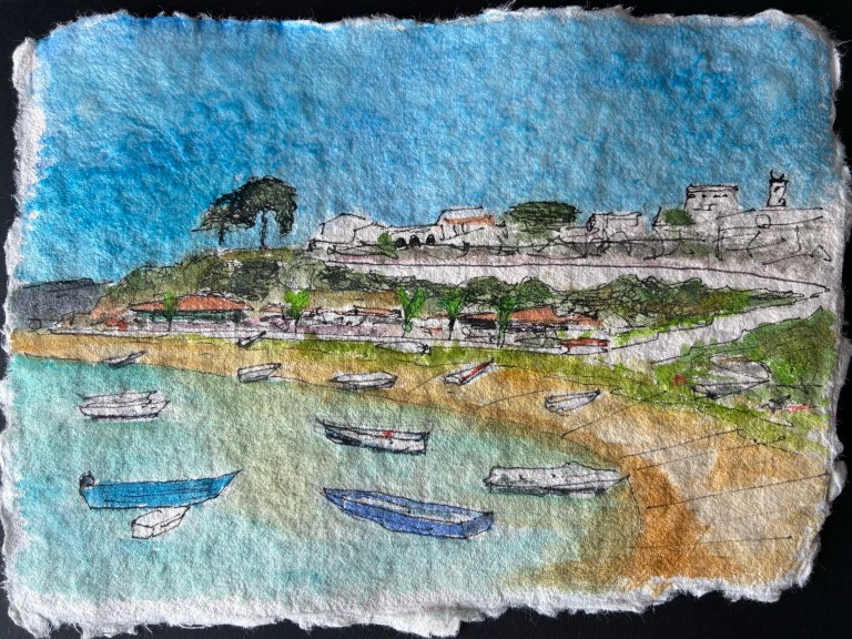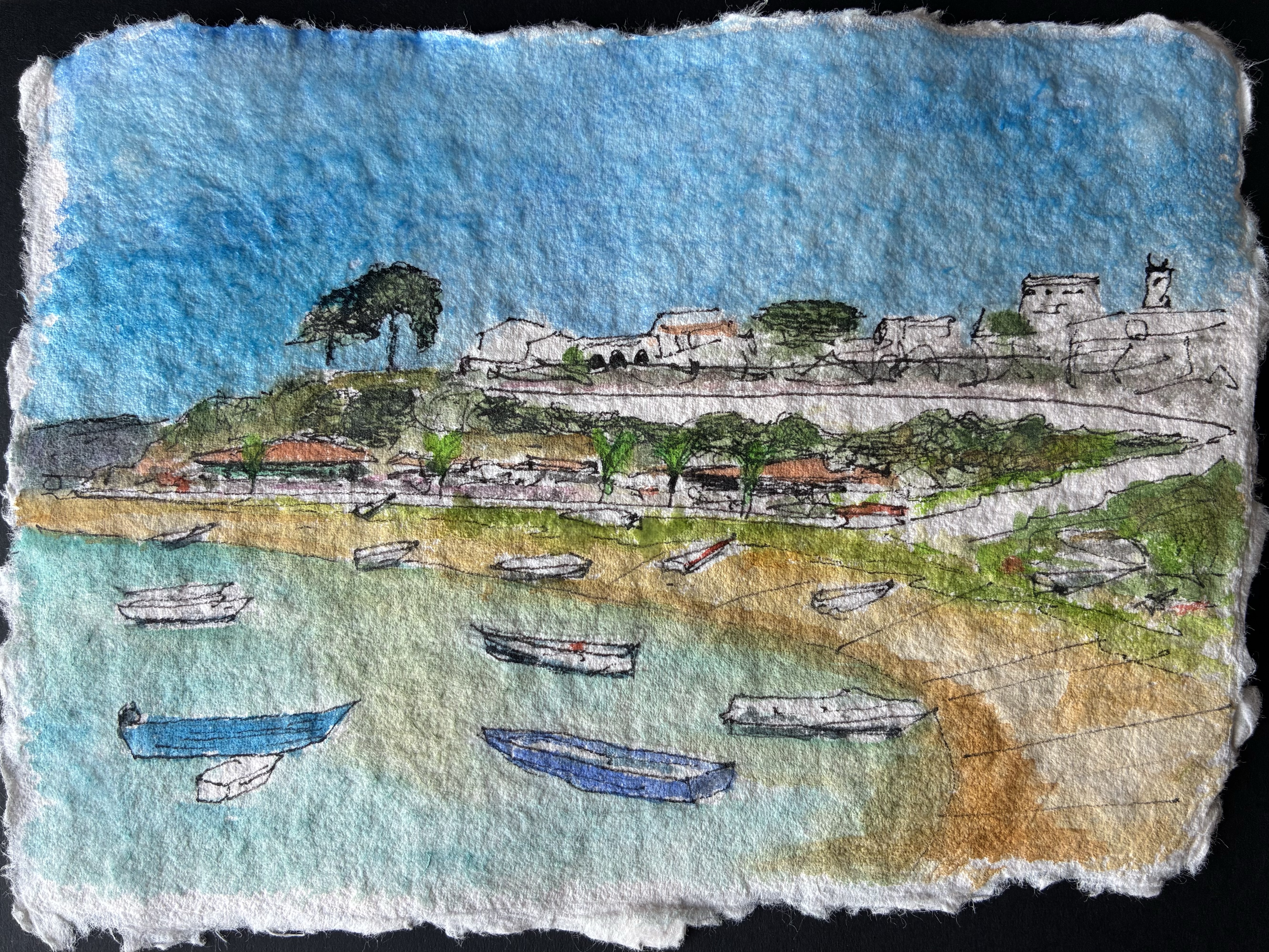 Ann’s birthday came and went. I had already confessed to my error, and the card was much appreciated nevertheless, but, quite obviously, I was left feeling that I had not quite struck the target. So, a few weeks later, when some spare minutes arrived, I did a new, and more careful, search for pictures of Alvor, plumped for a nice beach/waterfront scene, and set to work again. The result of my efforts is shown below.