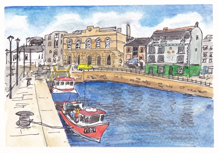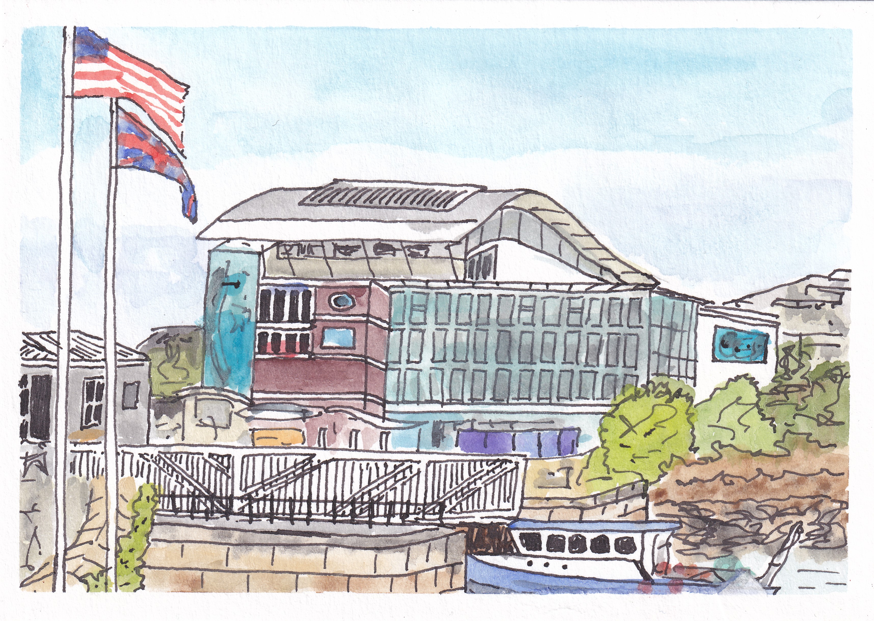 Painting number eight took me back to Sutton Harbour, this time looking across the swing bridge towards the Fish Market on the far left and the National Marine Aquarium, with its wavy roof in the centre. I’m please with the way I captured the blue colour of the windows and the advertising poster on the left of the building, and I like the foreground detail of the boat and bridge. Sadly, my attempt at a Union Jack flag was not quite so successful and the flag of the USA seems to have lost its stars…