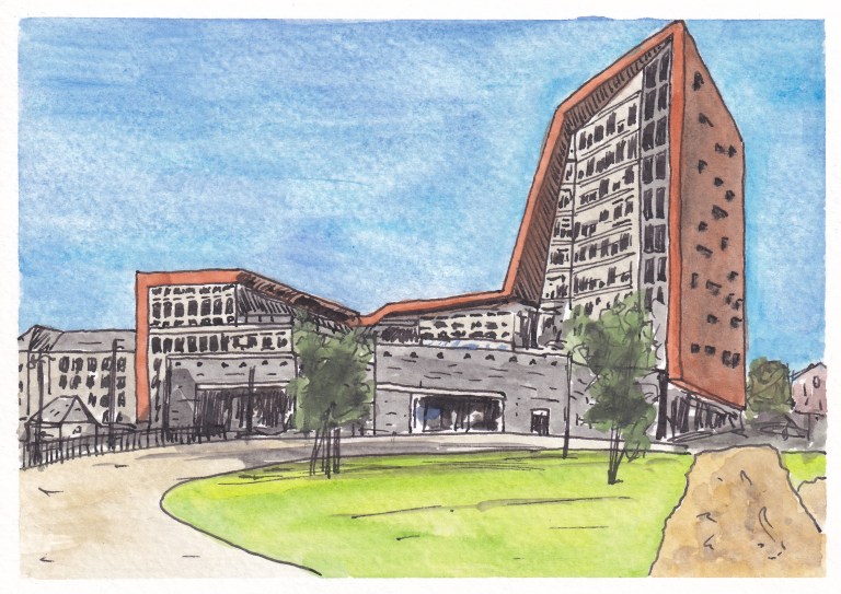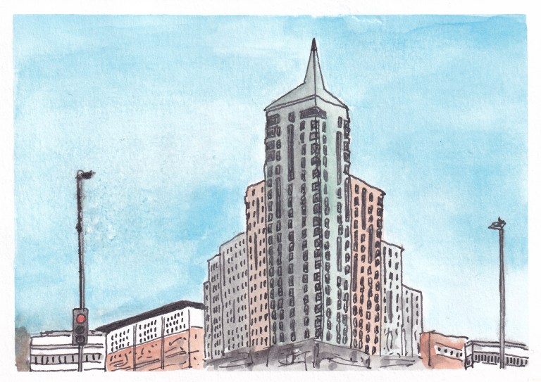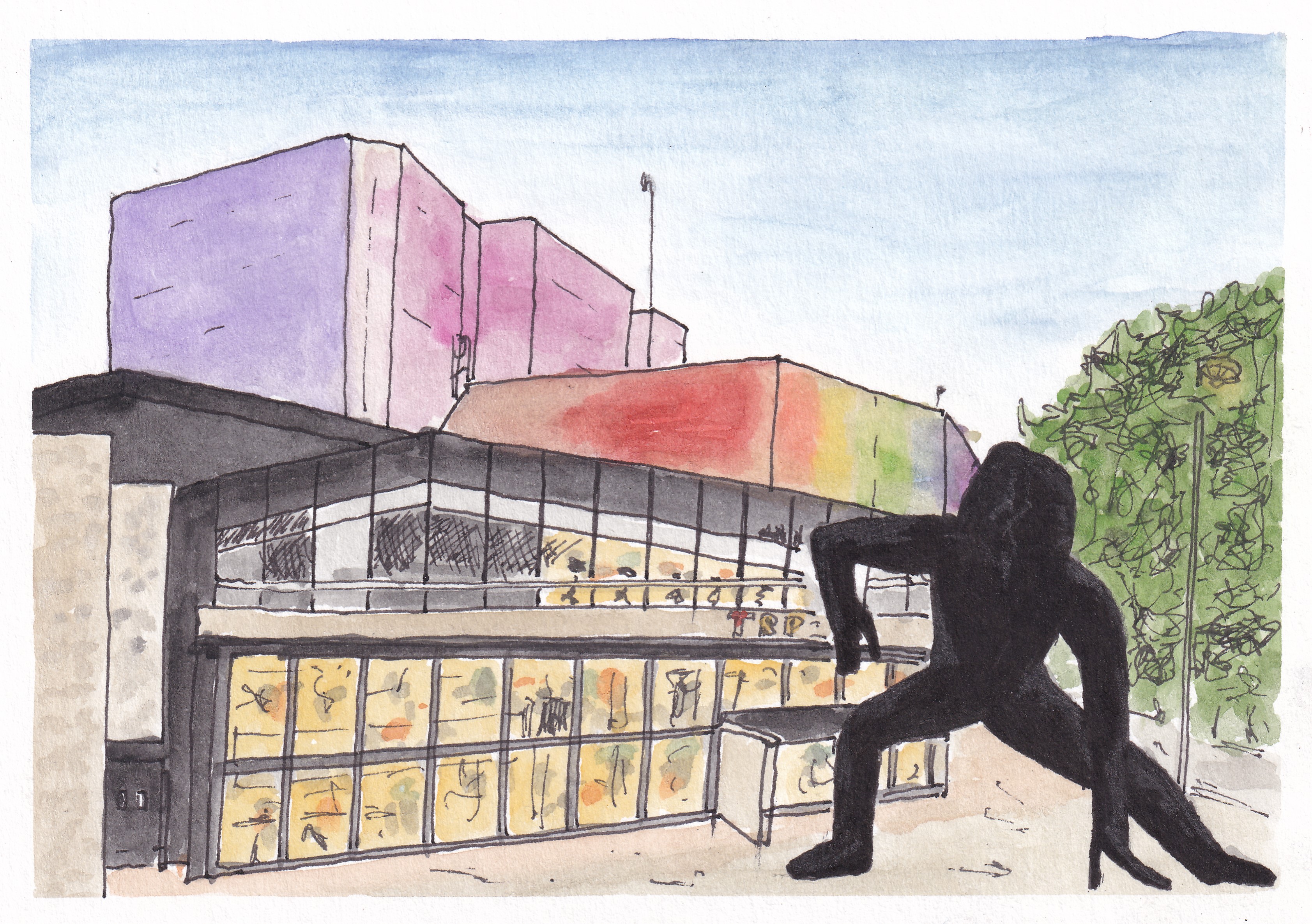 It was time to get a bit ‘arty’, so my next picture was of the interestingly illuminated Theatre Royal, with the imposing form of the statue ‘Messenger’ in front of it. I think that I did pretty well with the theatre itself, and the shape of the statue isn’t too bad, but my initial attempts to shade its dark form resulted in it looking like a hairy gorilla, and so I coloured it black with a permanent marker to try to salvage the picture. Unfortunately, this was only partially successful and I think I would have to describe this one as something of a ‘fail’…
