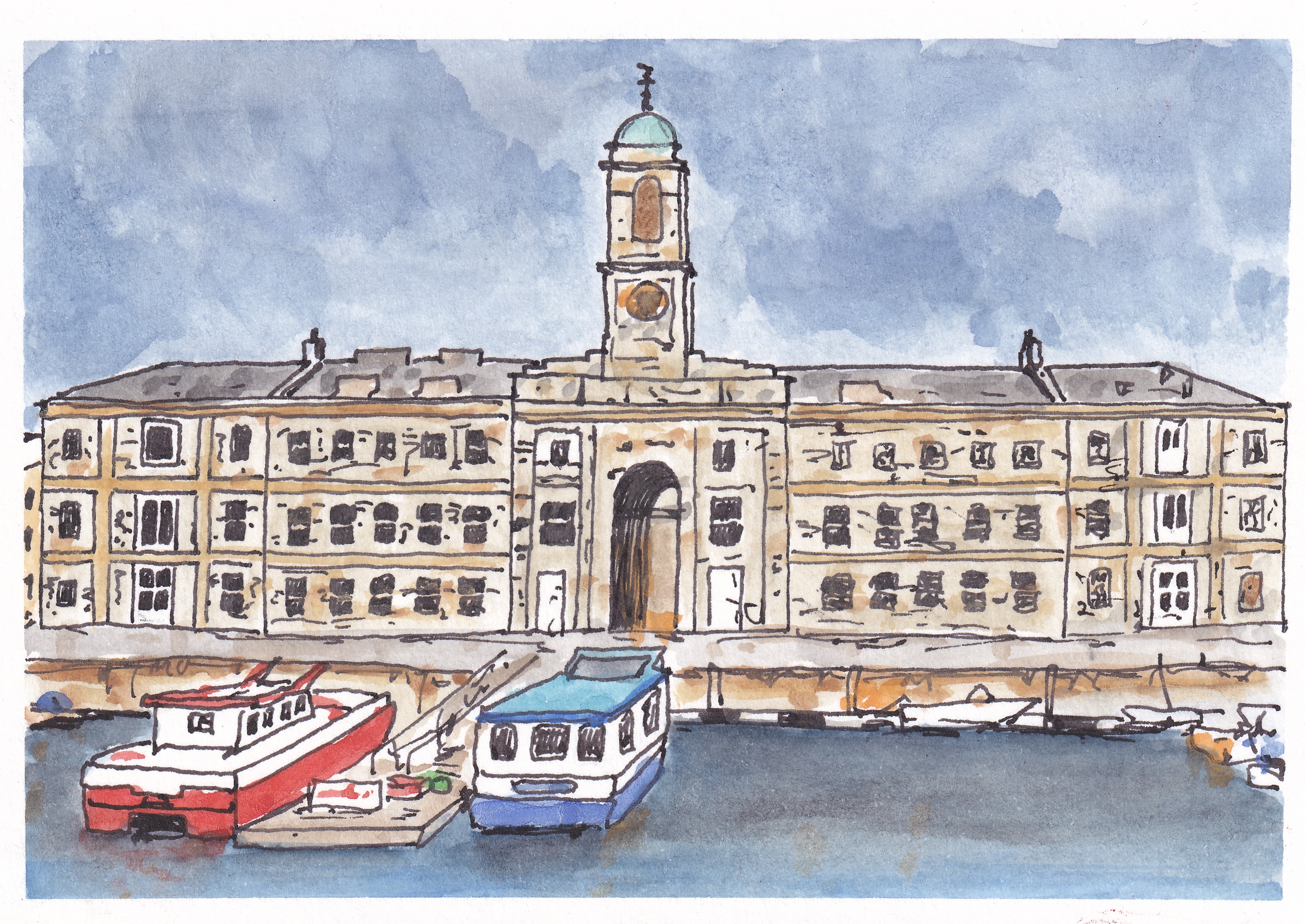 After painting a fairly new building, it was time to visit a much older one with a ffront-on view of one of the main buildings at the Royal William Yard, formerly the victualling yard for the Royal Navy but now a home for swanky apartments, restaurants, various studios and art spaces, and a cinema. I think this is one of my favourites from the series…