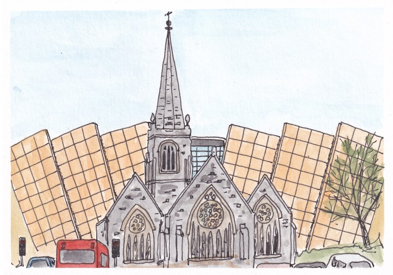 Then, it was back to the city centre for a picture showing the Charles Church, bombed in the Second World War and left in its broken state as a memorial to lives lost. Behind it, the angular exterior of the eastern end of the Drake Circus Shopping Centre forms an interesting backdrop which was surprisingly challenging to paint…