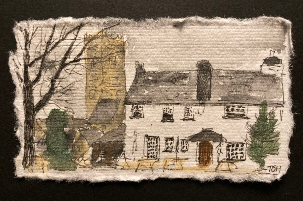 In the last couple of months it seems to have become routine that every time a family member or a close friend has a birthday I paint a small picture of a place that has a special meaning or is a favourite for them and use it to make a bespoke birthday card. Back towards the end of January it was my sister’s turn, and knowing how much she liked to visit the Periwinkle Tea Rooms at Selworthy, on the fringe of Exmoor in Somerset, the choice of subject matter was an easy one for me to make.