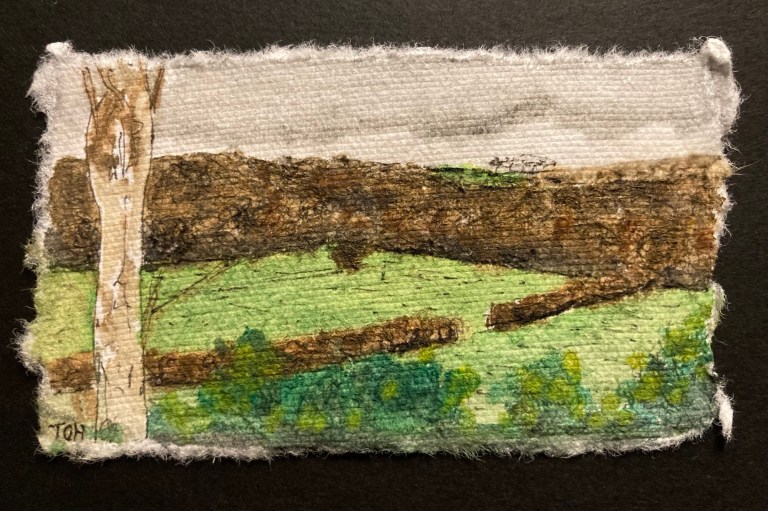 I’m reasonably happy with this second picture. I think the Silver Birch tree on the left has come out fairly well and I like the clump of trees on the horizon but I don’t think I have fully captured the texture of the leafless trees in the middle ground or the spires of gorse in the foreground. Despite its faults, I think I have captured the general impression reasonably well and I’m also pleased to have got in a bit more practice in quickly producing this kind of miniature landscape picture. I’m thinking about trying to produce pictures of this type more often (‘dailyish’ if I can) and I may have a go at seeing whether they might sell for a few pounds somewhere one day.